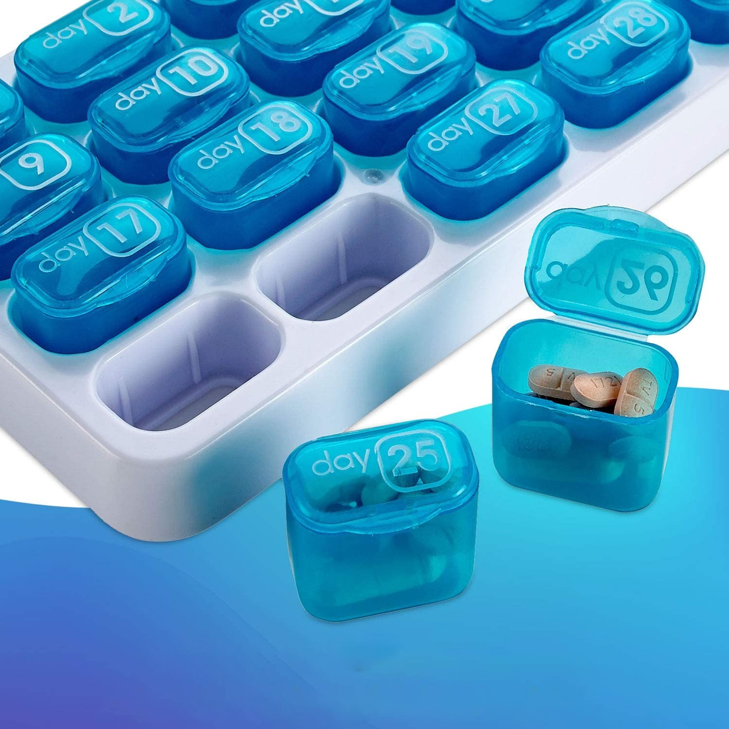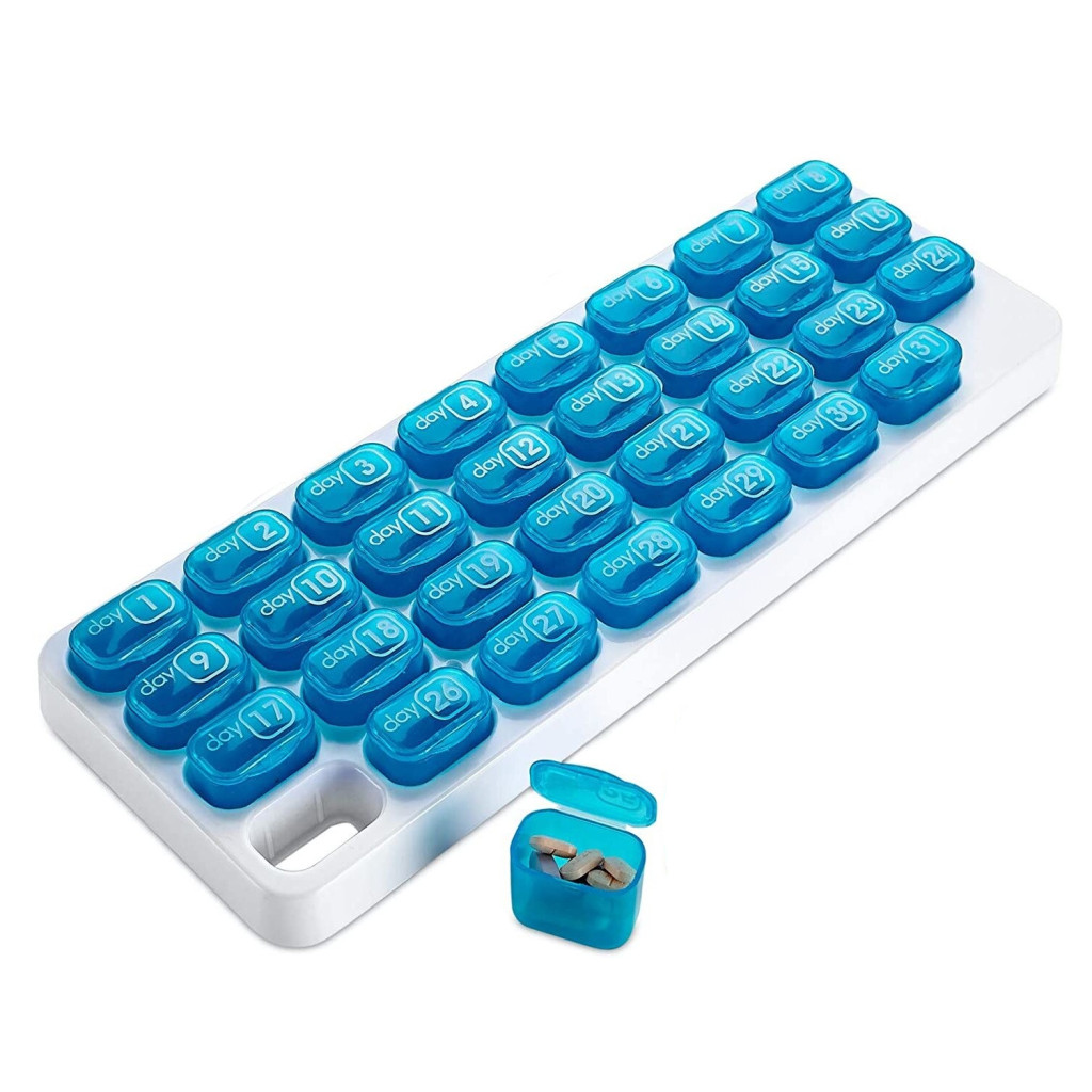Ez a praktikus gyógyszeradagoló segít rendszerezni a gyógyszereket és vitaminokat egy teljes hónapra. Kompakt kialakítása révén a kivehető rekeszek könnyedén elférnek táskában vagy zsebben, így ideális otthoni és utazási használatra is. Tartós műanyagból készült, mérete: 28,5 × 10,5 × 2,8 cm.