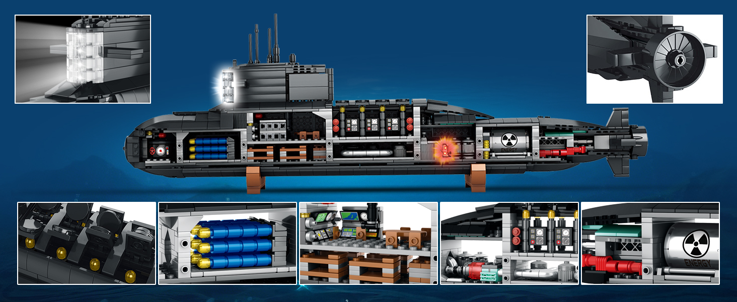 A tengeralattjáró valósághű technikai elemekkel rendelkezik, többek között radarantennával, szonárrendszerrel, torpedócsövekkel, nukleáris reaktorral, ballisztikus rakétákkal és szegmentált rekeszekkel. Az oldalpanel nyitható, így felfedi a belső szerkezet összetett részleteit – igazi mérnöki csoda minden korosztály számára, aki szereti a precizitást és a technikai kihívásokat.
