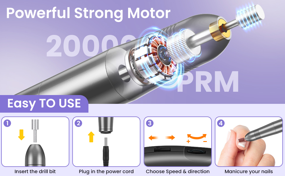 Erős, mégis halk működés – A magas minőségű alumínium ház és a fejlesztett motor alacsony zajszintet, rezgést és hőtermelést biztosít, így a használat még hosszabb ideig is kényelmes marad. A körömcsiszoló gyorsan és fájdalommentesen távolítja el a lakkot és az egyéb rétegeket, anélkül, hogy károsítaná a körömfelszínt.